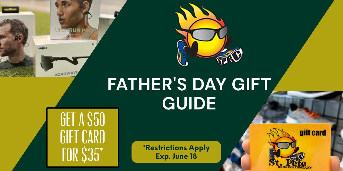 We’re running a discount on gift cards just in time for Father’s Day. When you purchase a $50 Gift Card in our online store, you’ll get it for only $35. That saves you $15! Use THIS LINK https://stpeterunningco.fittedrunning.com/?coupon-code=DAD24&sc-page=shop and you’ll be redirected to our web store. Type in 50.00 as the amount for the gift card (can be used for either the e-gift card or the store gift card), and once you hit Checkout, the discount will be automatically applied. You can also visit our Online Shop HERE and manually type in the code DAD24 at checkout. This discount applies to a $50 gift card purchased online only. Does not apply to any gift cards purchased in person at our store. Expires 6/18/24.